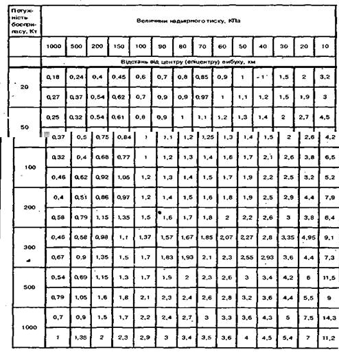 Величини надмiрного тиску ударноi хвилi при рiзних потужностях ядерного вибуху i вiдстанях вiд його центру наведено в табл. 1.