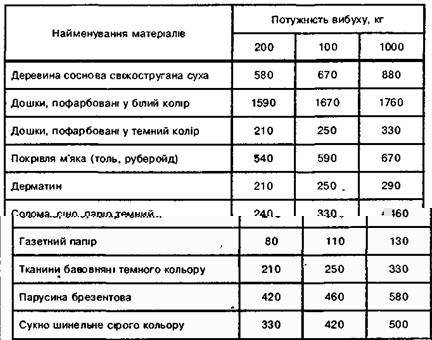 Таблиця 2. Свiтловi iмпульси КДж/м2, що викликають загоряння деяких матерiалiв при рiзних потужностях ядерного вибуху