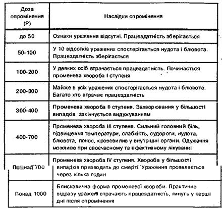 Таблиця 3. Наслiдки опромiнення залежно вiд отриманих доз