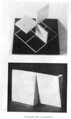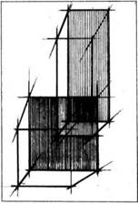 При измерении соотношений трех типовых состояний объемно-пространственной формы обнаруживается возможность перехода от объема к плоскости, от плоскости к линии.