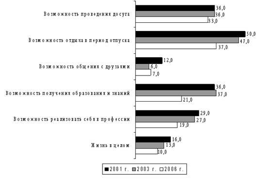 Обращает на себя внимание достаточно значимое снижение доли негативно оценивающих возможность получения необходимого образования и знаний тАУ с 36%-37% в 2001-2003 гг. до 21% в 2006 г.(рис.1). [4]