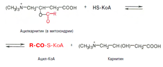 Реакция протекает при участии спецефического цитоплазматического фермента карнитин-ацилтрансферазы. После прохождения ацилкарнитина через мембрану митохондрий происходит обратная реакция тАУ расщепление ацилкарнитина при участии HS-KoA и митохондриальной карнитин-ацилтрансферазы: