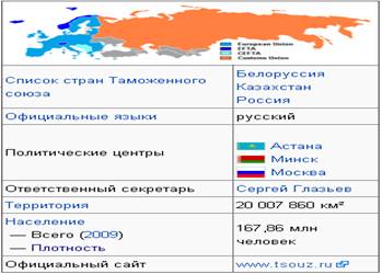 Таможенный союз Республики Беларусь, Республики Казахстан и Российской Федерации тАФ межгосударственный договор о создании единого таможенного пространства, подписанный Россией, Белоруссией и Казахстаном.