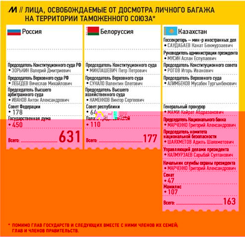 На ближайшей встрече в рамках комиссии Таможенного союза главы правительств России, Белоруссии и Казахстана подпишут соглашение об освобождении от личного досмотра багажа высших чиновников трех стран. ВлМаркерВ» ознакомился с согласованной версией этого документа. Там есть любопытные моменты. Например, в список льготников включаются не только действующие, но и бывшие президенты государствтАУчленов Таможенного союза. А круг освобождаемых от личного досмотра казахских чиновников гораздо шире, чем российских и белорусских. Этот момент вызвал удивление даже в российском МИДе.