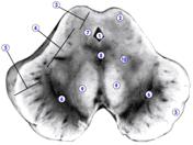 На рисунке: 1 тАУ corpus callosum, 2 тАУ cavum septi pellucidi, 3 тАУ septum pellucidum, 4 тАУ fornix (поперечный разрез столбов), 5 тАУ comissura anterior, 6 тАУ adheiso interthalamica, 7 тАУ comissura posterior, 8 тАУ tectum mesencephali, 9 тАУ corpus pineale, 10 тАУ thalamus, 11 тАУ ventriculus tertius, 12 тАУ nucl. caudatus.
