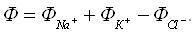 Суммарный поток положительно заряженных частиц через мембраны равен сумме потоков одновалентных катионов минус сумма потоков одновалентных анионов.