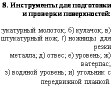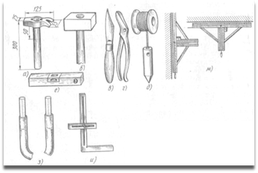 Инструменты для подготовки и проверки поверхностей (рис. 8 ,а..и). Штукатурный молоток ИР-559 (ГОСТ 11042тАФ83) в одном конце имеет обушок размером 25X25 мм, на другом тАФ изогнутые рожки с прорезями для вытаскивания гвоздей. Молоток насаживается на ручку длиной 300 мм. Масса молотка 600 г и ручки рассчитана на то, чтобы можно было за два удара забивать штукатурные гвозди.
