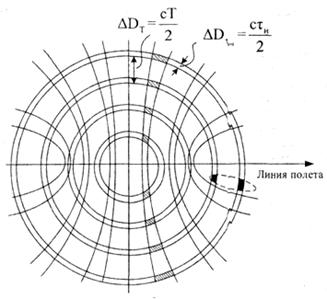 Нанесем на кольца дальности (рис. 14) линии равных доплеровских частот, называемых изодопами. Изодопы имеют вид гипербол и определяются скоростью носителя РЛС. Ширина изодопы соответствует полосе пропускания доплеровского фильтра Δf.