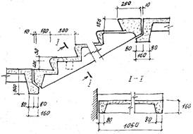 Железобетонные лестницы из крупноразмерных элементов получили очень широкое распространение. Элементы (марши и площадки, изготовленные на заводе) лестниц краном устанавливаются на место и скрепляются сваркой закладных деталей. Такие лестницы изготавливаются или с фактурными поверхностями ступеней и площадок или с накладными проступями (рис. 106, 107, 109).