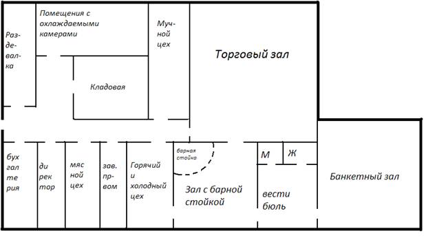 В данном предприятии организована цеховая структура, которая включает следующие цеха: горячий, холодный, мучной, мясной. В каждом цехе организованы рабочие места, оснащенные всем необходимым оборудованием и инвентарем. Имеются следующие помещения: склад, кладовая суточного запаса сырья, моечная столовой посуды, моечная кухонной посуды, торговый зал, бар.