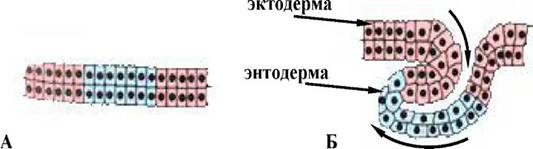 Мал. 1. Схема процесу iнвагiнацii: А - рух пласта клiтин; Б - инвагiнацiйна гаструла.