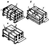 | Бескаркасная система зданий: а - с продольным расположением несущих стен; б - с поперечным расположением несущих стен; в - перекрестная; 1 - наружные и внутренние несущие стены; 2 - плиты междуэтажных перекрытий; 3 тАУ наружные самонесущие стены; 4 - торцовая несущая стена; 5 - продольные и поперечные несущие стены; 6 - плиты перекрытия, опертые по контуру. |