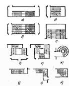 | Типы лестниц: а, 6 - двухмаршевая; в - то же, с перекрещивающимися мартами; г - то же, с парадным средним маршем; д - трехмаршевая; е - четырехмаршевая; ж - винтовая; з - одномаршевая внутриквартирная; и, к-внутриквартирная с забежными ступенями. |