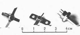 В качестве полупроводниковых материалов для изготовления Т. используют преимущественно германий и кремний. В соответствии с технологией получения в кристалле зон с различными типами проводимости (см. Полупроводниковая электроника) Т. делят на сплавные, диффузионные, конверсионные, сплавно-диффузионные, мезатранзисторы, эпитаксиальные, планарные (см. Планарная технология) и планарно-эпитаксиальные. По конструктивному исполнению Т. подразделяются на Т. в герметичных металлостеклянных, металлокерамических или пластмассовых корпусах и бескорпусные (рис.2); последние имеют временную защиту кристалла от воздействия внешней среды (тонкий слой лака, смолы, легкоплавкого стекла) и герметизируются совместно с устройством, в котором их устанавливают. Наибольшее распространение получили планарные и планарно-эпитаксиальные кремниевые Т.