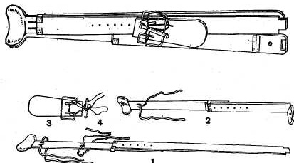 2. Накладывание шины: подошвенную часть шины фиксируют бинтом к подошвенной поверхности стопы; наружную (наружный костыль) более длинную часть раздвигают и закрепляют с таким расчетом, чтобы она начиналась от подмышечной впадины и, вставленная в металлическую пружину в подошвенной части, выступала за нее на 8тАФ10 см; внутреннюю часть шины (внутренний костыль) подготавливают таким образом, чтобы она упиралась в пах и проходила через металлическую проушину подошвенной части, выступая за нее на 8тАФ10 см; конечную (шарнирную) часть сгибают под углом 90В° и вставляют в особый паз конца наружной части шин; на конечности шину фиксируют циркулярными ходами бинта; вверху наружную часть шины фиксируют двумя ремнями. При помощи палочки-закрутки осуществляют вытяжение за подошвенную часть шины