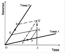 Допустим, что существуют два товара, производимые с помощью двух факторов производства тАФ труда и капитала. Товар 1 тАФ относительно более трудоемкий, а товар 2 тАФ относительно более капиталоемкий. Пусть вектор 01 на рисунке 5.7 показывает наиболее эффективную технологию (количество труда, приходящееся на единицу капитала) производства товара 1, и поскольку он является трудоемким, то располагается ближе к горизонтальной оси, а вектор 02 показывает наиболее эффективную технологию производства товара 2, и поскольку он является капиталоемким, то располагается ближе к вертикальной оси. Обеспеченность страны в целом трудом и капиталом показана точкой G, которая означает, что в стране имеется OJ труда и JG капитала. При таком количестве факторов производства товар 1 производится в объеме F, а товар 2 тАФ в объеме Е.