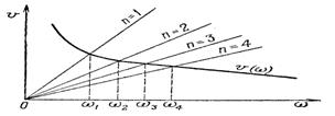 Многочастотность ЛБВ с внутренней обратной связью может быть пояснена также графически (рис. 7) путем сопоставления зависимости условия баланса фаз от частоты генерируемых колебаний с дисперсионной характеристикой замедляющей системы ЛБВ тАФ v(w). Учитывая, что фазовые скорости прямой и отраженной волн практически одинаковы (vП = v0 = v) и намного меньше скорости света, а эквивалентная длина коаксиальных переходов на входе и выходе ЛБВ незначительна по сравнению с длиной спирали замедляющей системы (L << l ), зависимость условия баланса фаз от частоты генерируемых колебаний для разных п с достаточной степенью точности графически может быть представлена наклонными прямыми