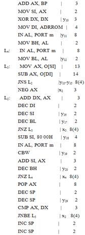 Программа разработана в соответствии с алгоритмом, показанным на рис. 2. На рис. 8 приведён текст программы на языке ассемблера и соответствие микрокоманд алгоритма.