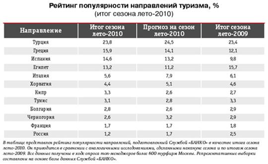 Рисунок 1. Рейтинг популярности направлений туризма, итог сезона 2010