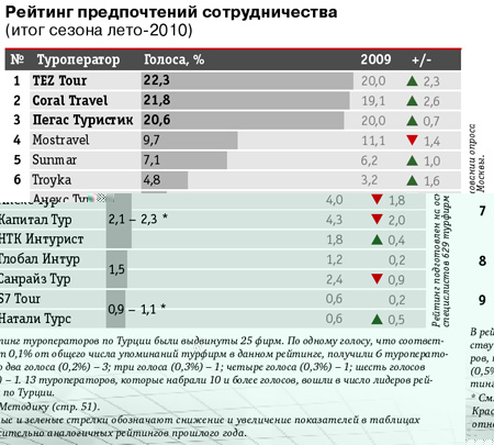 Вся тройка лидеров, контролирующая львиную долю турпотока в Турцию, прибавила Влв весеВ». TEZ Tour по сравнению с итогами сезона-2009 получил еще 2,3% агентских предпочтений. Движение вверх считают объяснимым. ВлВ прошлом году, сразу после кризиса, компания проводила политику сдержанности и сокращения объемов. А сейчас действует более активно, наступательноВ», тАУ объяснили эксперты. Кстати, в актив TEZ Tour можно записать и успехи компании Тroyka, которую считают крупнейшим субагентом туроператора (+1,6% голосов в сравнении с летом-2009).