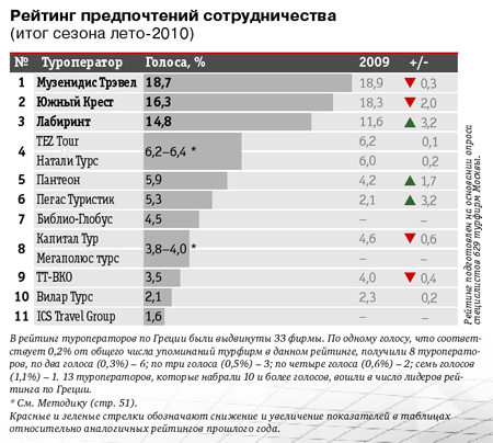 ВлПегас ТуристикВ», судя по заметному росту (+3,2%), увеличил свою активность на направлении. И действительно, агентства утверждают, что все лето его цены на Крит были едва ли не самыми низкими на рынке. Дебютант рейтинга ВлБиблио-ГлобусВ» в свой первый сезон по Криту также выделился броскими тарифами. И получил 4,5% голосов. ВлЖестко входил в рынок, приходилось подстраиватьсяВ», тАУ комментируют его действия другие игроки.