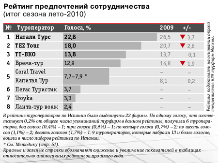 Лидеры испанского рейтинга сохранили позиции, но у всех наблюдается некоторый отток голосов: ВлНатали ТурсВ» тАУ минус 3,7%, TEZ Tour тАУ 2,6%, ВлВремя-турВ» тАУ 1,9%. И только ВКО удалось остаться при своих. Перейдя под бренд TUI, эта компания расширила перевозку на Испанию, и в итоге тактика защиты нападением сработала.