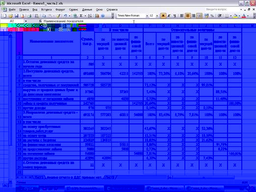 Анализ движения денежных средств можно проводить прямым и косвенным методом. Методика анализа движения денежных средств прямым методом достаточно проста и удобна для расчета показателей и контроля за поступлением и расходованием денежных средств. В долгосрочной перспективе прямой метод анализа дает возможность оценить уровень ликвидности предприятия. В оперативном управлении финансами прямой метод может использоваться для контроля за процессом формирования выручки от реализации и выводов относительно достаточности денежных средств для платежей по финансовым обязательствам. Основным документом для анализа денежных потоков является отчет о движении денежных средств. Отчетную форму № 4 "Отчет о движении денежных средств" следует дополнить расчетами относительных показателей структуры притока и оттока денежных средств по видам деятельности. Для этого используем прикладной программный продукт Excel (рисунок 2.1).