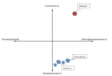 Таким образом, после построения карты восприятия можно видеть, что проект "MyShelf" находиться в ниши, так как только данный проект среди всех конкурентов на рынке предоставляет возможность общения и особое, личное пространство.