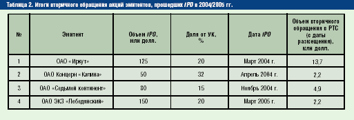 Для участников рынка ценных бумаг жизненно важно наличие ликвидного вторичного рынка. Проведение процедуры IPO - стартовый момент для ценной бумаги. В действующем российском законодательстве нет нормы, устанавливающей минимальную долю акций, находящихся в свободном обращении. Проведение IPO способно лишь отчасти гарантировать присутствие такой доли на открытом рынке у "новых" компаний. Приведу пример итогов вторичного обращения акций эмитентов, осуществивших процедуру IPO в 2004/2005 гг.: