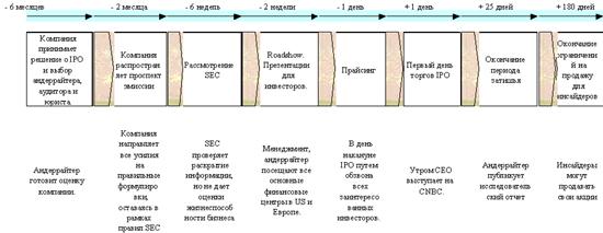 В результате моих исследований, я выявила, что при осуществлении IPO так же играет очень важную роль предварительный маркетинг. Его целью является получение отклика инвесторов для определения точного размера и ценового диапазона размещения. Информация, полученная в ходе предварительного маркетинга, также помогает менеджменту компании лучше подготовиться. Основой предмаркетинга, как выяснилось, служат аналитические отчеты, составленные аналитиками банков - членов синдиката размещения. Последовательность реализации данного вида финансирования для средних и умеренно-крупных российских компаний такова. Сначала организуется частное размещение акций и/или облигаций компании квалифицированным инвесторам. Затем привлекаются андеррайтеры для публичного размещения (IPO) в виде прямого листинга акций на электронном рынке ценных бумаг, региональных биржах США или общенациональной электронной бирже NASDAQ. Этап внебиржевой эмиссии занимает 3-4 месяца, стоит $40-$60 тыс. (плюс комиссия в 5-7% от общего объема размещения) и позволяет уже сам по себе привлечь до $5 млн. внешнего финансирования. Одновременно, создав сравнительно "малой кровью" прецедент размещения акций компании среди публичных инвесторов, частное размещение значительно облегчает следующий этап - прямой листинг акций - занимающий 6-9 месяцев (при заблаговременном планировании за 1,5-2 года). Стоит прямой листинг уже примерно $600.000 плюс андеррайтерская комиссия в размере 5-7%, но он позволяет сразу привлечь крупные суммы финансовых средств и одновременно получить статус компании, публично торгуемой на фондовом рынке. Более того, в дальнейшем возможно выстраивать "цепочки" частных и публичных размещений ориентированных на различные группы инвесторов, когда каждая новая эмиссия учитывает результаты предыдущей.