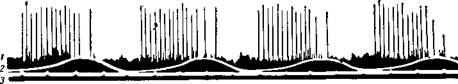 Рисунок 4 тАУ Токи действия в блуждающем нерве при растяжении легочной ткани во время вдоха (по Эдриану) Сверху вниз: 1 тАУ афферентные импульсы в блуждающем нерве: 2 тАУ запись дыхания (вдох тАУ вверх, выдох тАУ вниз); 3 тАУ отметка времени