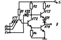В схеме на рисунке 1.5 на транзисторах VT2тАФVT4 реализован сложный инвертор, осуществляющий операцию ВлНЕВ», что позволило обеспечить высокую нагрузочную способность, достаточное быстродействие и помехоустойчивость схемы. Кроме того, в выходной цепи отсутствует сквозной ток по цепи +5В через R3 тАУ VT3 тАУ VD тАУ VT4 тАУ общий провод, т.к. в любом состоянии закрыт один из транзисторов либо VT3, либо VT4.