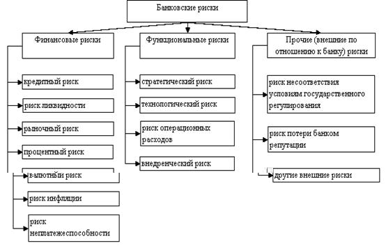 Множество авторов сходятся во мнении, что банковские риски можно разделить на три группы: финансовые риски, функциональные риски и прочие (внешние по отношению к банку) риски.
