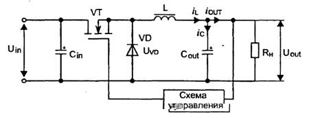 Входное напряжения Uin подается на входной фильтрующий конденсатор Cin. Ключевой элемент VT, в качестве которого может быть использован транзистор любого типа (биполярный, MOSFET, IGBT), осуществляет высокочастотную коммутацию тока. Кроме этого, в составе преобразователя должны быть разрядный диод VD, дроссель L, конденсатор Сout, образующие выходной LC-фильтр, а также схема управления, осуществляющая стабилизацию напряжения или тока нагрузки с сопротивлением Rн. Как видно из рисунка, ключевой элемент VT, дроссель и нагрузка включены последовательно, поэтому этот стабилизатор относят к классу последовательных схем.