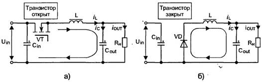 Итак, фаза накачки энергии протекает на протяжении времени tu, когда ключевой элемент VT открыт, то есть проводит ток (рис. 3, а). Этот ток далее проходит через дроссель L к нагрузке, шунтированной конденсатором Сout. Накопление энергии происходит как в дросселе, так и в конденсаторе. Ток iL увеличивается.