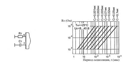 Время паузы можно регулировать, выбирая соответствующий номинал времязадающего конденсатора Ст. Частота работы задающего генератора определяется соотношением Rт и Ст (выбор этих элементов частотозадающей цепи, показанных на рис. 5, осуществляется из графика на рис. 6). Ощутимые значения времени паузы получается при достаточно больших номиналах емкости Ст.