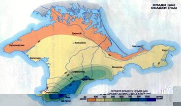 Продукты конденсации водяного пара, выпадающие из атмосферы в жидком или твердом состоянии (дождь, град, снег, снежная крупа и др.), называются осадками. По территории Крыма, в связи со сложностью рельефа и циркуляционными процессами, они распределяются очень неравномерно. Есть такие районы (юго-восточная оконечность Керченского полуострова и мыс Меганом вблизи Судака), где годовое количество осадков бывает менее 300 мм, и такие (западные яйлы), где величина их превышает 1000 мм.
