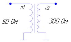 Антенна обычно подвешивается на деревянных, асбоцементных или стеклопластиковых опорах. В данном случае устанавливаем антенну на деревянных опорах. Заземление поглощающего сопротивления и переходного трансформатора выполняется из 10 радиально расходящихся медных проводов длинной 10 м., укладывающихся на глубине 30см. Так как антенны бегущей волны является не симметричной, то используем коаксиальный несимметричный фидер с малым затуханием. В этом случае фидер соединяется с антенной через переходной трансформатор 300×50 (рис.7).