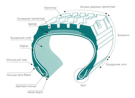Вывод: Рассмотрев устройство шины можно сделать вывод, что современная шина имеет довольно сложное строение, определяющее её потребительские свойства, надёжность и безопасность.