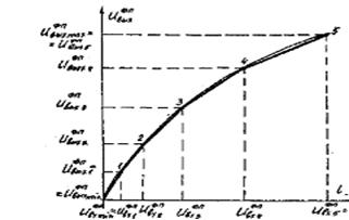 Если зависимость ЭДС датчика от измеряемой величины задана графической зависимостью, то передаточную характеристику функционального преобразователя находят путем построений. Для этого рекомендуется построить на листе миллиметровой бумаги в увеличенном масштабе график ес= f (l) (рис.6), выделить на нем точки I и 5, соответствующие минимальной и максимальной ЭДС датчика и провести через точку 5 и начало координат ось симметрии.