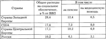 Как следует из приведенных данных, к началу XX столетия в европейских странах расходы на социальное обеспечение достигли 25% ВВП, в США тАФ 18%, в странах с переходной экономикой Центральной Европы тАФ 17%, а в России тАФ чуть более 10%. Следует особо подчеркнуть, что это расходы государства в целом на социальное обеспечение, куда входят наряду с расходами на социальное страхование и социальные расходы-пособия по безработице, социальные пенсии и др. Что же касается собственно доли затрат на социальное страхование в ВВП, то она колеблется на уровне 7-8%.