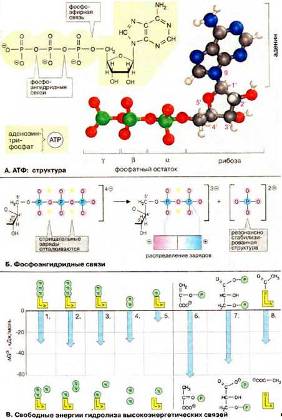 В клетке химическая энергия запасается в виде так называемых ВлвысокоэнергетическихВ» метаболитов. Наиболее важным таким метаболитом, макроэргом обеспечивающим энергией большое число энергозависимых реакций, является АТФ. Рис. 8 (А).