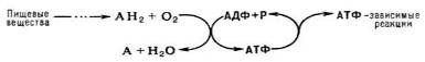 Окислительное фосфорилирование, синтез АТФ из аденозиндифосфата и неорг. фосфата, осуществляющийся в живых клетках, благодаря энергии, выделяющейся при окислении орг. в-в в процессе клеточного дыхания. В общем виде окислительное фосфорилирование и его место в обмене в-в можно представить схемой: