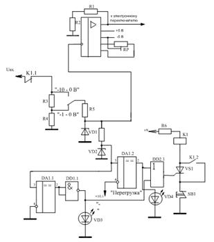Входное устройство состоит из схемы защиты от перенапряжения, схемы индикации перегрузки и обратной полярности, а также делителя.