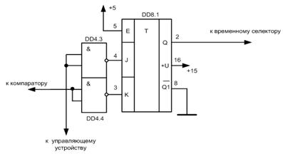 В качестве триггера возьмём JK- триггер К155ТВ1 [4], схема подключения которого изображена на рисунке 10. Работа JK- триггера объясняется на основе таблицы состояний.