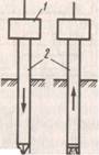 Параллельно с yкладкой смеси извлекают (вытягивают) обсадную трубу из грунта, причем металлический башмак остается в основании сваи. В это время молот двойного действия, вновь соединенный с обсадной трубой, уплотняет бетонную смесь при этом сила его погружающего удара в два раза меньше выдергивающих усилий, передаваемых на обсадную трубу. При ударах молота, направленных вверх, труба должна извлекаться на 4..5 см из грунта, а при ударах, направленных вниз, - погружаться на 2.. 3 см.