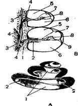 В тАФ схема поперечного разреза части улитки; тАФ костный стержень;2 тАФ спиральная костная пластинка; 3 тАФ волокна улиткового нерва;4 тАФ скопление тел первого нейрона слухового проводящего пути; 5 тАФ лестница преддверия; 6тАФлестница барабана; 7тАФ улитковая часть перепончатого лабиринта;8 тАФ кортиев орган; 9 тАФ основная пластинка.