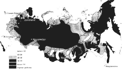 В Северном полушарии в холодное время года сезонный снежный покров устанавливается на площади 59 млн. км . Территория нашей страны укрыта снежным покровом толщиной от нескольких десятков сантиметров до 1 м и более на протяжении срока от 2тАФ3 мес. в году на юге страны до 8 тАФ 9 мес. на севере (рис. 1).