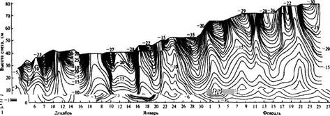 Рисунок 4 - Температурный режим снежной толщи в коренной темнохвойной фации зимой 1965/66 г. Центральная часть Западной Сибири