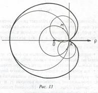 Сначала выберем опорную окружность и ее радиус ОА примем за 1, а прямую ОА тАФ за ось абсцисс, причем точка А произвольно выбирается на опорной окружности. Проведем другую окружность с центром в точке М, произвольно взятой на опорной окружности, и радиусом МА. Повторив затем такие построения для достаточно большого числа точек М, равномерно распределенных по опорной окружности, увидим, что огибающая всех окружностей радиуса МА и есть кардиоида (рис. 13).